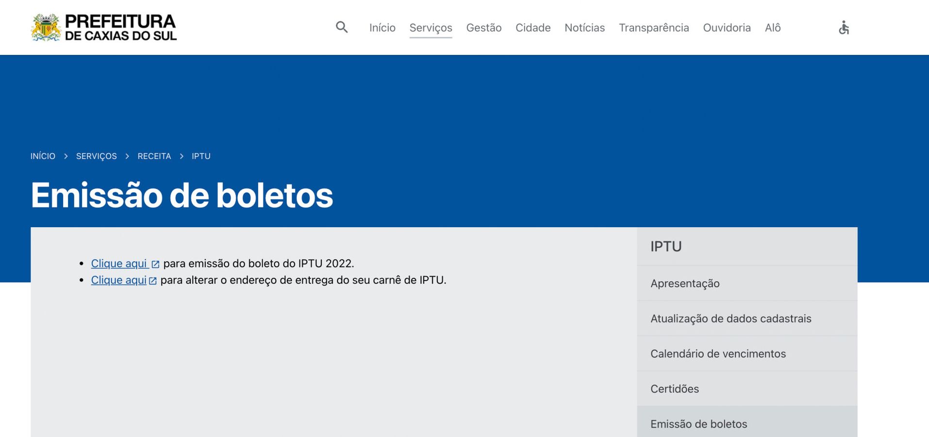 Já está disponível para emitir o IPTU de 2022 através do site da prefeitura de Caxias do Sul, tendo o número de inscrição do imóvel e o CPF ou CNPJ do titular, acesse o site da prefeitura, vá em serviços online e após em IPTU 2022 ou clique no link: